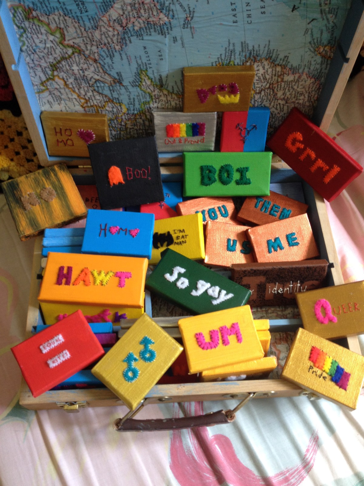 Our next stall holder is Tricia, who creates amazing and colourful mini stitched artworks with queer and geeky themes.