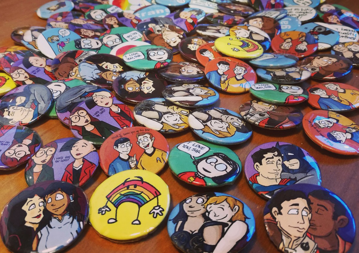 Sam from Rooster Tails is back with his collection of queer and trans comic art, queer couples postcards, badges and prints, and other exciting things!