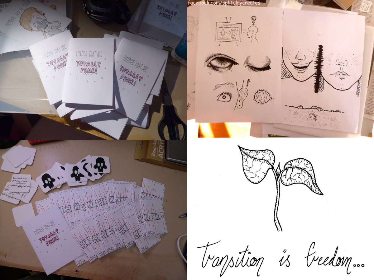 We’re so excited to have Splitclay, who is new to our market, join us this year. Clay is a queer artist creating zines and art about their experiences, and they like to help people feel less lonely with their art.